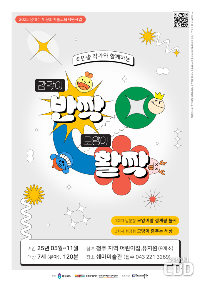 쉐마미술관이 충청북도와 충북문화재단 예술교육지원센터에서 추진하는 △2025년 생애주기 문화예술교육지원사업의 일환으로, 유아 대상 예술 창작 프로그램 《감각이 반짝, 모양이 활짝》을 성공적으로 순항중이다. 본 프로그램은 청년 작가 최민솔과 청주시 내 어린이집·유치원 9개소의 7세 유아들이 함께하여, 조형 활동을 통해 공간과 경계의 개념을 배우도록 기획되었다.