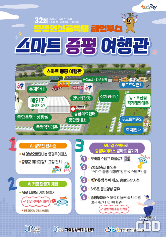 충북 증평군이 오는 25일부터 28일까지 열리는 제32회 증평인삼골축제 현장에서 ‘스마트 증평 여행관’을 운영하며 증평 관광의 미래 비전을 선보인다.