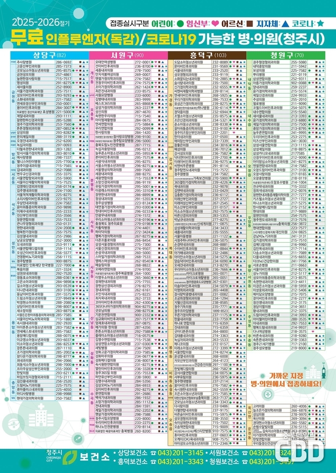 상당보건소 관계자는 “시민들의 인플루엔자 면역력 강화를 위해 무료 접종 대상자는 기간 내 반드시 예방접종 받으시길 권장한다”고 말했다.