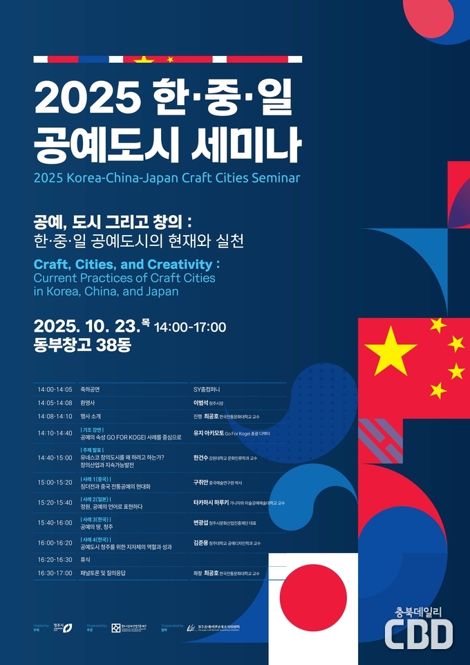 청주공예비엔날레조직위원회(위원장 이범석 청주시장, 이하 조직위)는 오는 23일 오후 2시 문화제조창 동부창고 38동에서 ‘2025 한·중·일 공예도시 세미나(Korea-China-Japan Craft Cities Seminar)’를 개최한다.