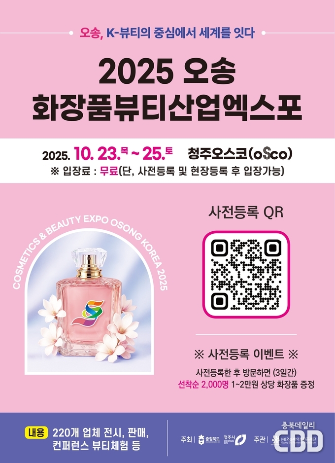 ‘오송, K-뷰티의 중심에서 세계를 잇다’를 주제로 개최되는 ‘2025 오송화장품뷰티산업엑스포’ 행사가 10월 23일(목)부터 25일(토)까지 3일간 청주오스코(OSCO)에서 개최된다. 충청북도와 청주시가 공동 주최하고 (재)오송바이오진흥재단이 주관한다.