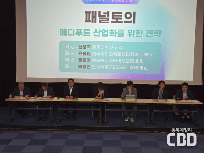 이어‘메디푸드 산업화를 위한 전략’을 주제로 한 패널 토의로 이어져, 윤승원 한국바이오특화센터협의회 부장, 신용국 세명대학교 교수, 정준영 충북농식품바이오협회 회장, 배승현 한국식품클러스터산업진흥원 부장이 참여해, 식품 기업의 실제 현장 적용 방안을 심도있게 논의했다.