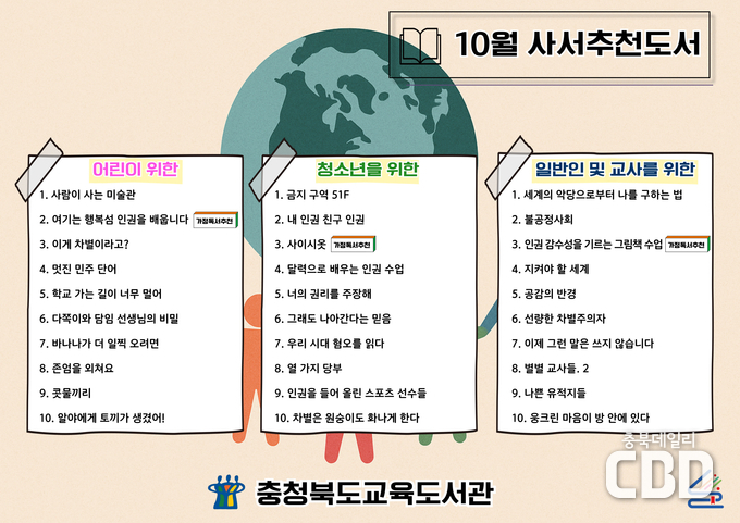 충청북도교육청 직속기관 교육도서관(관장 이상래)은 <사람답게 살고 있습니까, 휴먼?(인권)>을 주제로 2025년 언제나 책봄 열두달 북큐레이션 10월 사서추천도서 30권을 선정했다.