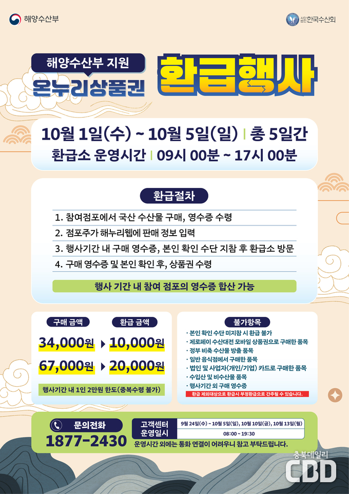 청주시는 추석을 맞아 수산물 소비 활성화를 위해 10월 1일부터 5일까지 전통시장 온누리상품권 환급행사를 추진한다.