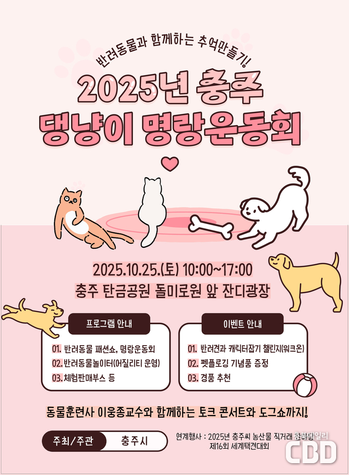 충주시가 오는 10월 25일 토요일 탄금공원 일원에서 반려동물과 반려인이 함께 즐길 수 있는 특별한 축제 ‘2025년 충주 댕냥이 명랑운동회’를 개최한다.