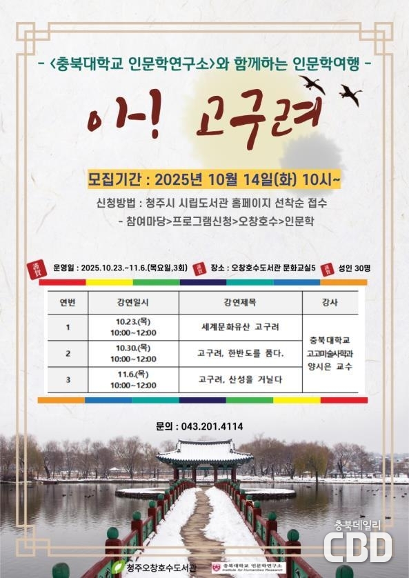 청주오창호수도서관은 충북대학교 인문학연구소와 협력해 청주시민의 인문 소양 증진을 위한 인문학 강좌 ‘인문학 여행 : 아! 고구려’를 오는 23일부터 운영한다.