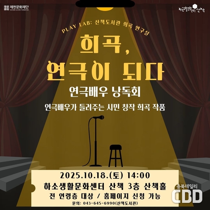 제천문화재단(이사장 김상수)이「2025년 문학상주작가 지원사업」의 일환으로 상주작가와 마지막 문학프로그램인 <희곡, 연극이 되다> 연극배우 낭독회를 오는 18일 하소생활문화센터 산책에서 선보인다.