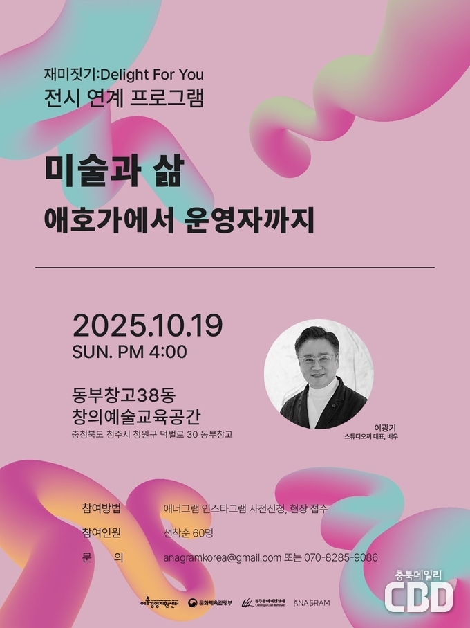 이번 강연은 2025 청주공예비엔날레에서 만나는 신진작가 전시 ‘재미 짓기 : Delight for you(이하, 재미 짓기)’와 연계한 프로그램으로, 미술 애호가에서 아트 스튜디오의 운영자로 예술을 통해 삶의 재미를 풍성하게 지어온 배우 이광기 씨의 세상을 엿보는 기회다.