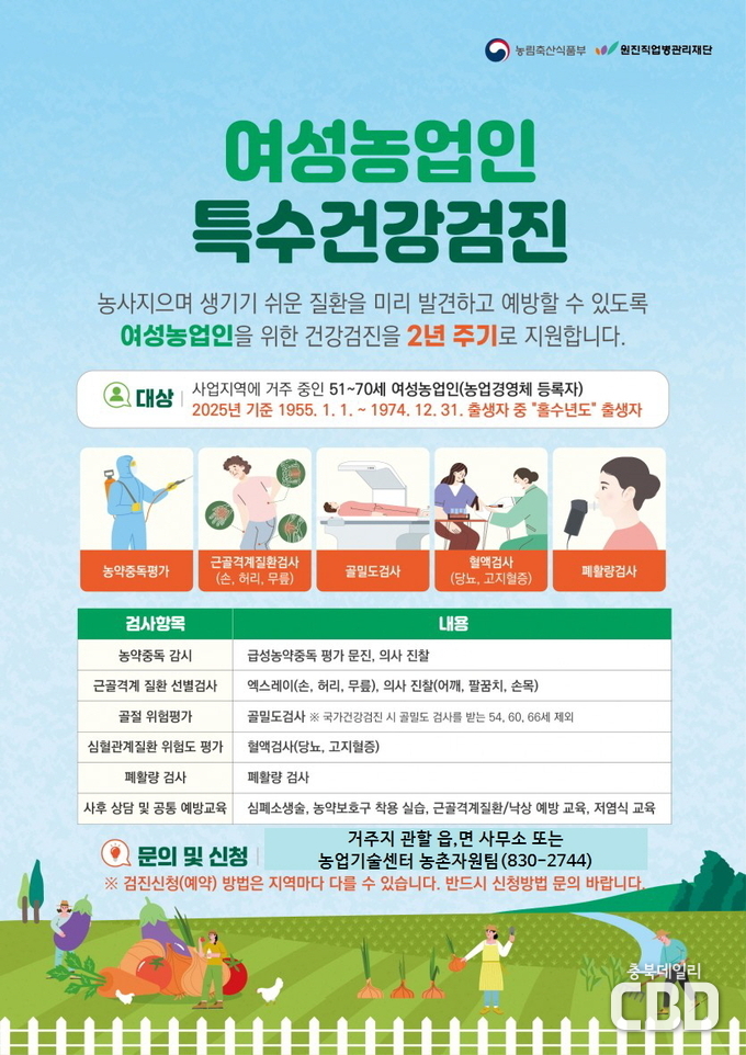 충북 괴산군(군수 송인헌)은 여성농업인의 건강복지 향상을 위한 ‘2025년 여성농업인 특수건강검진’ 사업의 추가 대상자를 오는 27일까지 모집한다고 밝혔다.
