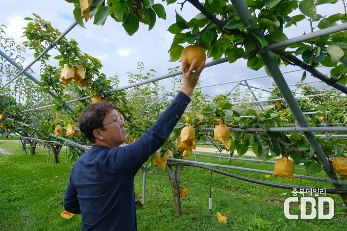 충북 영동군 영동읍 매천리 과일나라테마공원에서 수령 100년이 넘는 배나무들이 올해도 어김없이 황금빛 열매를 맺었다.