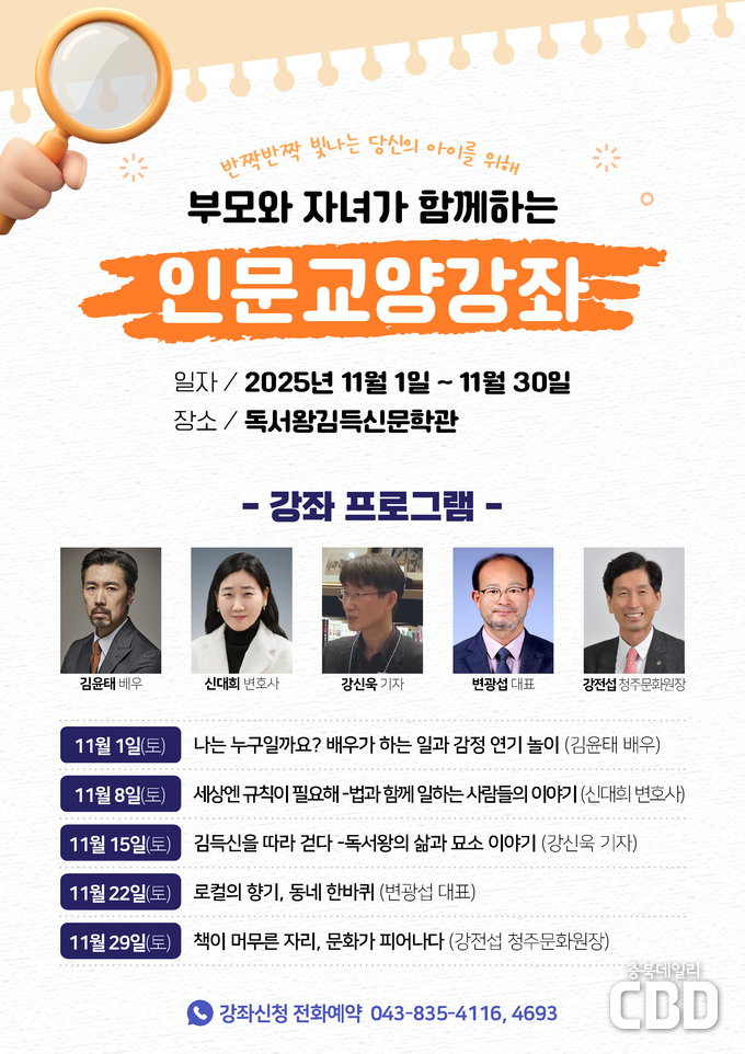 이번 강좌는 11월 한 달간 매주 토요일 오후 2시, 총 5회에 걸쳐 진행되며, 세대가 함께 공감하고 배움의 즐거움을 나눌 수 있는 다채로운 강의로 구성됐다.