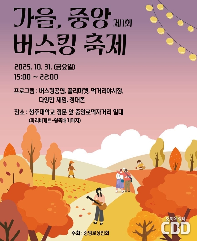 청주대중앙로상인연합회(회장 안재룡)는 오는 31일 오후 3시부터 10시까지 청주대 중앙로 먹자거리(파리바게트~왕뚝배기 한 블록)에서 ‘제1회 가을중앙버스킹축제’를 개최한다고 밝혔다.