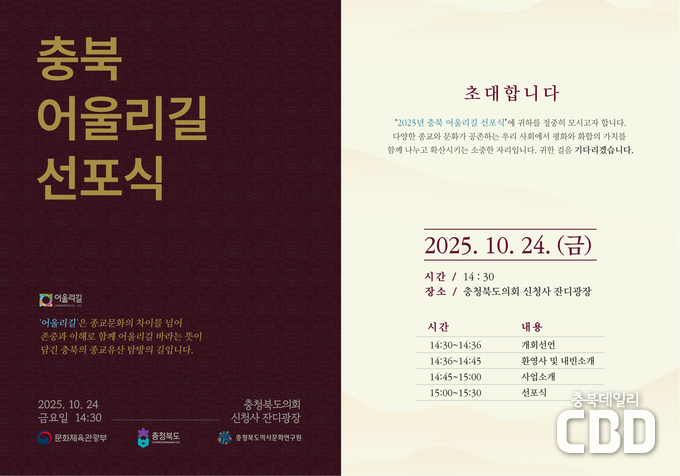 김영환 지사는 “오늘 선포식은 종교의 울타리를 넘어 새로운 화합의 길을 여는 뜻깊은 자리”라며, “어울리길이 앞으로도 도민의 일상 속에 자연스럽게 스며들고, 충북이 대한민국 종교 평화의 중심지로 우뚝 설 수 있도록 노력을 이어가겠다”고 밝혔다.