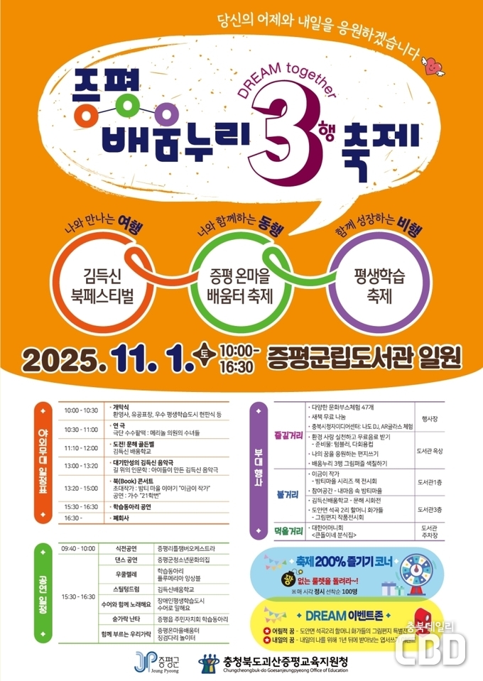 충북 증평군이 내달 1일 오전 10시부터 오후 5시까지 증평군립도서관 일원에서 ‘2025년 증평 배움누리 3행 축제: 당신의 어제와 내일을 응원합니다’를 개최한다.