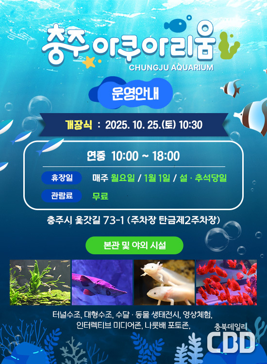 “충주아쿠아리움 개장… 내륙 수생태 명소로 새 출발” 143억 원 투입해 능암늪지생태공원에 완공...73종 2400마리 전시 - 무료 개방으로 교육·체험·휴양이 어우러진 복합 생태 명소 기대 - |