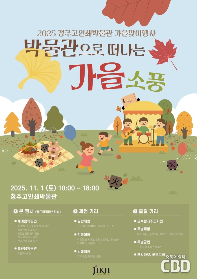 가을을 맞아 청주고인쇄박물관에서 다채로운 행사가 펼쳐진다. 청주고인쇄박물관은 오는 11월 1일 박물관 일원에서 가족 단위 방문객을 위한 다양한 프로그램을 운영한다고 28일 밝혔다.