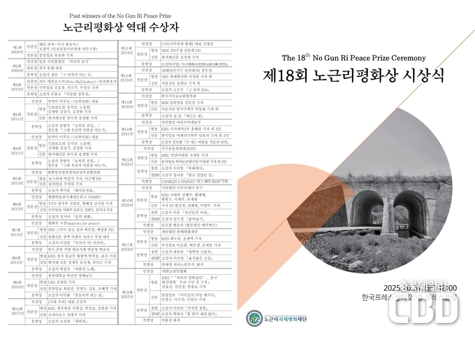 (사)노근리국제평화재단(이사장 정구도)은 오는 10월 31일(금) 오후 6시, 한국프레스센터 20층 프레스클럽에서 '제18회 노근리평화상 시상식'을 개최한다. 노근리평화상은 2008년 제정되어 올해로 18회를 맞이하며, 인권·자유·평화·정의의 가치 실현에 기여한 개인과 단체를 선정하여 시상하고 있다. 특히 올해는 노근리사건 발생 75주년을 맞이하는 뜻깊은 해로, 노근리를 넘어 치유와 상생의 새로운 지평을 여는 의미 있는 시상식이 될 전망이다.