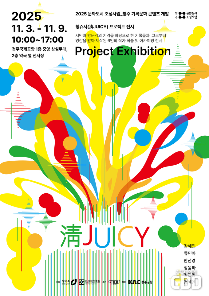 2025 문화도시조성사업 ‘청주 기록문화 콘텐츠 개발’ 시민공모의 일환으로 마련된 이번 프로젝트는, 청주시민과 여행객들에게 새로운 예술적 경험을 선사하기 위해 기획됐다. 청주 지명에 담긴 맑고 청량한 이미지를 활용해 ‘청쥬시(淸JUICY)’라는 이름을 붙였다.