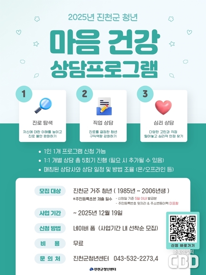 충북 진천군청년센터는 지역 청년들의 심리적 안정과 진로 고민 해소를 돕기 위해 ‘마음건강상담 프로그램’을 운영 중이라고 18일 밝혔다.