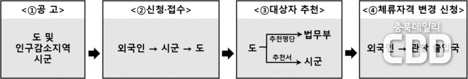 지원대상 기업 요건은 ▲도내 인구감소지역(제천, 보은, 옥천, 영동,괴산, 단양)에 소재하여야 하며 ▲도내 대학 졸업(예정) 유학생(D-2) 또는 구직자(D-10)를 1년 이상 근로계약하고, 6개월 이상 고용을 유지하여야 한다. 유학생 채용과정에서 발급되는 비자는 지역특화형 우수인재(F-2-R)이다.