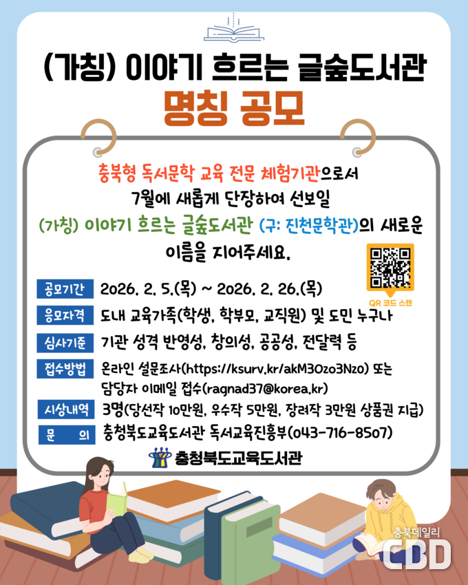 노재경 교육도서관장은 “이번 명칭 공모는 앞으로 조성될 글숲도서관의 정체성과 방향을 함께 만들어가는 출발점”이라며, “충북 교육가족과 도민들의 많은 관심과 참여를 부탁드린다.”라고 말했다.