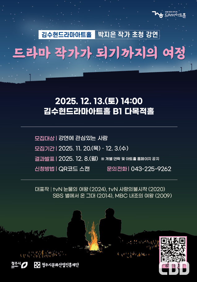 이번 강연은 K-드라마를 대표하는 드라마·방송 분야 전문가들을 초청해 그들의 작품 세계와 경험을 나누는 김수현드라마아트홀의 특화 프로그램으로 그동안 노희경, 김은희, 박해영 작가와 이순재, 송승환, 장미희 배우 등 대한민국을 대표하는 작가와 배우들이 청주를 찾아 드라마 팬들과 만나왔다.