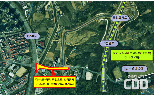 이번 사업은 양궁장입구 5거리에서 국도대체우회도로(3순환로)로 이어지는 도시계획도로(상당구 용정동 230-4번지 일원, 0.26km)를 기존 4차로에서 6차로로 넓히는 공사로, 총사업비는 48억원이 투입된다.