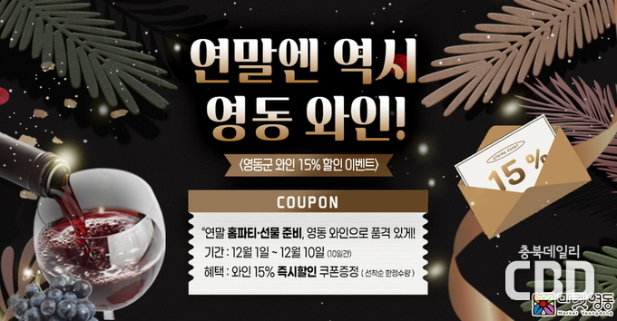 또한 10일까지는 영동군 대표 특산품인 와인 전 품목을 15% 할인하는 ‘연말 감사 이벤트’도 진행된다. 군은 이번 할인 행사를 통해 연말 홈파티용 와인, 선물용 와인, 연말 모임 답례품 등으로 활용하기 좋은 영동 와인의 매력을 널리 알릴 계획이다.