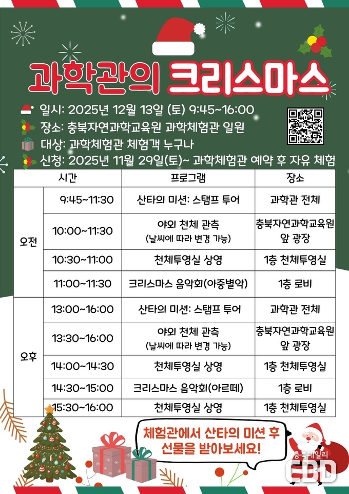 충청북도교육청 직속기관 자연과학교육원(원장 지성훈)은 10일(수)부터 13일(토)까지 크리스마스 주간으로 정하고, 수학체험센터와 과학체험관에서 각각 특별행사를 운영한다.