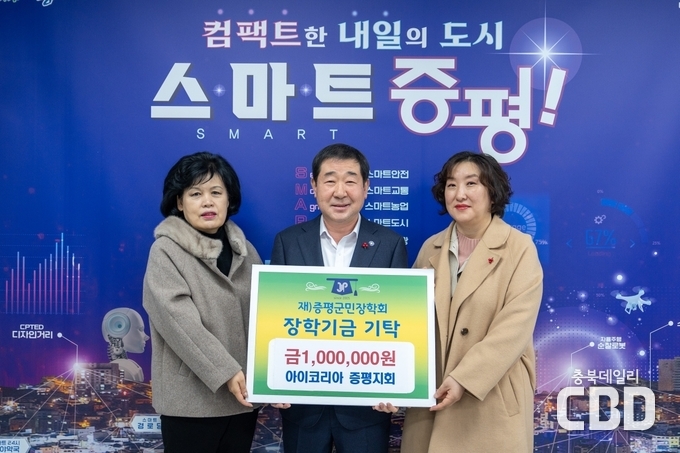 충북 증평군은 아이코리아 증평지회(회장 이수희)가 23일 군청을 방문해 지역 인재 양성을 위해 써달라며 (재)증평군민장학회(이사장 이재영 증평군수)에 장학금 100만원을 기탁했다고 밝혔다.