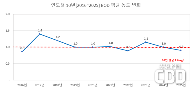 충청북도보건환경연구원(원장 임헌표)은 도내 하천 215개 지점을 대상으로 실시한 수질 조사 결과 생물화학적산소요구량(BOD) 전체 평균 농도는 0.9 mg/L로 작년 전체 평균 농도인 1.0 mg/L보다 소폭 감소했고 하천 생활환경기준 Ⅰ등급 비율이 '24년 대비 증가했다고 밝혔다.