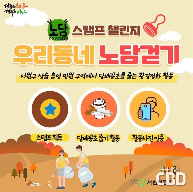 ‘노담걷기’는 노(NO) 담배, 즉 금연을 목표로 걷기 활동과 함께 담배꽁초를 줍는 환경정화 활동을 결합한 실천형 캠페인이다. 청주시민이면 누구나 참여할 수 있다.