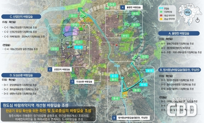 ∙ 청주시, ‘기후 문제 대응’ 도시바람길숲 2차년도 사업 추진 - 올해 63억원 투입, 무심동로·단재로·생명누리공원 등 확대 |