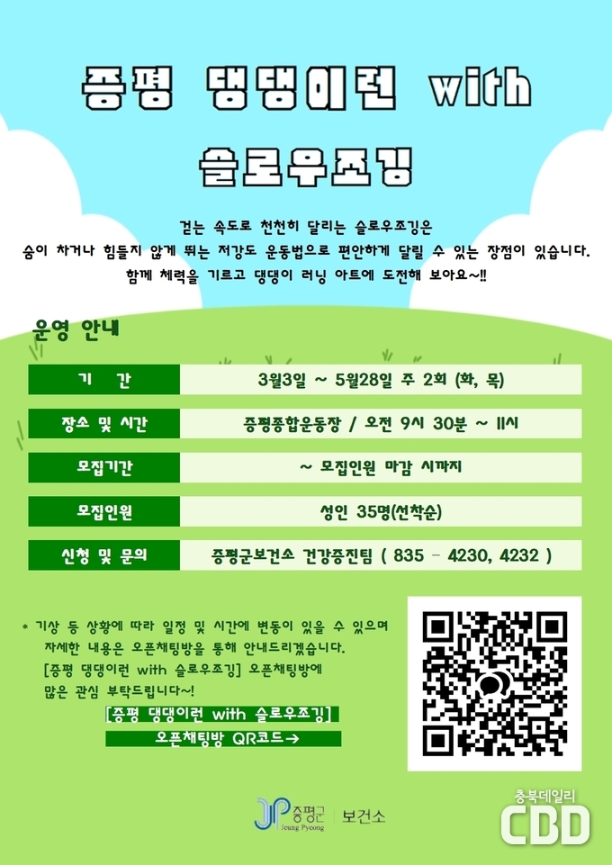 충북 증평군보건소가 지역주민의 신체활동 증진과 만성질환 예방을 위해 슬로우조깅 프로그램 참여자 35명을 이달 27일까지 선착순 모집한다.