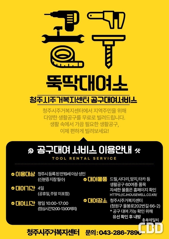 공구 목록 확인과 대여 안내는 청주시주거복지센터 누리집에서 가능하며, 자세한 사항은 청주시 복지정책과 또는 청주시주거복지센터로 문의하면 된다.