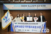 □ 보은군, 청소년정책 전국 평가서 ‘도내 유일’ 국무총리표창 쾌거 충북 보은군은 ‘2025년 청소년정책 우수지자체 정부포상식’에서 국무총리표창을 수상했다고 11일 밝혔다. 이번 정부포상은 지난 10일 서울 은행회관 국제회의실에서 열렸다. 성평등가족부에서 청소년정책을 적극 추진하고 우수한 성과를 거둔 지자체를 대상으로 시상했으며 전국 17개 시도와 228개 시군구를 대상으로 진행됐다. 올해 정부포상은 △대통령표창 3점 △국무총리표창 6점 △장관표창 10점이 수여됐으며, 충청북도 내에서는 보은군이 유일하게 수상하며 청소년정책의 우수성을 전국적으로 인정받았다. 보은군은 인구소멸지역이라는 열악한 여건 속에서도 청소년을 지역의 미래 핵심 주체로 육성하기 위해 실효성 있는 정책을 지속적으로 추진해 온 점에서 높은 평가를 받았다. 특히 2023년 10월 개관한 보은군청소년센터는 △청소년전용공간 조성 △키오스크 기반 자율이용시스템 구축 △실내암벽장 및 VR‧AR 체험실 운영 △청소년 전용카페 도입 등 기존의 틀을 뛰어넘는 차별화된 시설 및 프로그램을 갖추며 큰 호평을 받았다. 또한 30년 이상 이어져 온 일본 자매결연도시와의 국제 청소년교류, 국내외 교류 활성화, 청소년