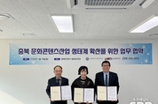 충북, 기관별 전문성 결집해 문화콘텐츠산업 생태계 조성 ‘시동’ - 충북과기원, 충북역사문화연구원, 충북문화재단 역사․문화․산업을 잇는 3대기관 업무협약 체결 - 충북과학기술혁신원(원장 고근석, 이하 ‘충북과기원’)은 충북 문화콘텐츠산업의 체계적인 육성과 산업 경쟁력 강화를 위해 충청북도역사문화연구원(원장 김양희), 충북문화재단(대표이사 김경식)과 함께 19일 「충북 문화콘텐츠산업 생태계 확산을 위한 업무협약」을 체결했다고 밝혔다. 이번 업무협약은 충북 고유의 스토리 소재와 자원을 발굴하여 창작과 사업화로 이어지는 문화콘텐츠산업 선순환 생태계 구축과 확산을 위해 추진하였으며, 이를 통해 ▲충북 국가유산의 스토리 자원화 및 콘텐츠 발굴, ▲문화콘텐츠 기획․제작․사업화 및 콘텐츠산업 생태계 확산, ▲예술 창작활동 지원 및 관광콘텐츠 개발 등을 상호 협력하여 충북 콘텐츠기업의 경쟁력을 높이고, 문화콘텐츠산업 활성화와 선순환 생태계를 확산시킬 계획이다. 충청북도역사문화연구원 김양희 원장은 “이번 업무협약을 계기로 충북의 역사․문화 자원의 디지털 전환을 촉진하고, 콘텐츠 원천 IP를 확충하여 지속 가능한 콘텐츠 산업 활성화에 기여하겠다“고 말했다.