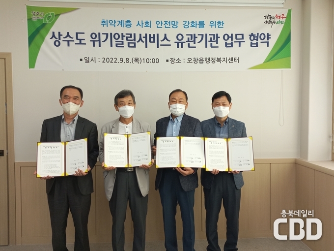 청주시 상수도사업본부는 오창읍행정복지센터, 오창읍이장단협의회, 오창읍지역사회보장협의체 3개 유관기관단체와 함께 8일 오창읍행정복지센터에서 업무협약을 체결하고 상수도 원격검침을 기반으로 한 위기알림 서비스를 실시한다.