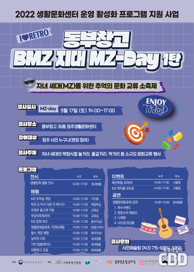 ▲MZ 오락실 게임 ▲푸딩아트테라피 ▲플레이스테이션 게임 체험 ▲우영우 돌고래 키링 만들기 ▲대형 레고 조립 등 다양한 체험부터 동부창고 생활문화동호회들의 합동 공연‧전시‧체험까지 힙하게 즐길 수 있는 이번 ‘MZ-DAY’는 이달 17일(토)과 10월 15일(토) 오후 2시~5시 동부창고 36동 청주생활문화센터에서 진행되며 별도의 사전 신청 없이 누구나 참여할 수 있다.