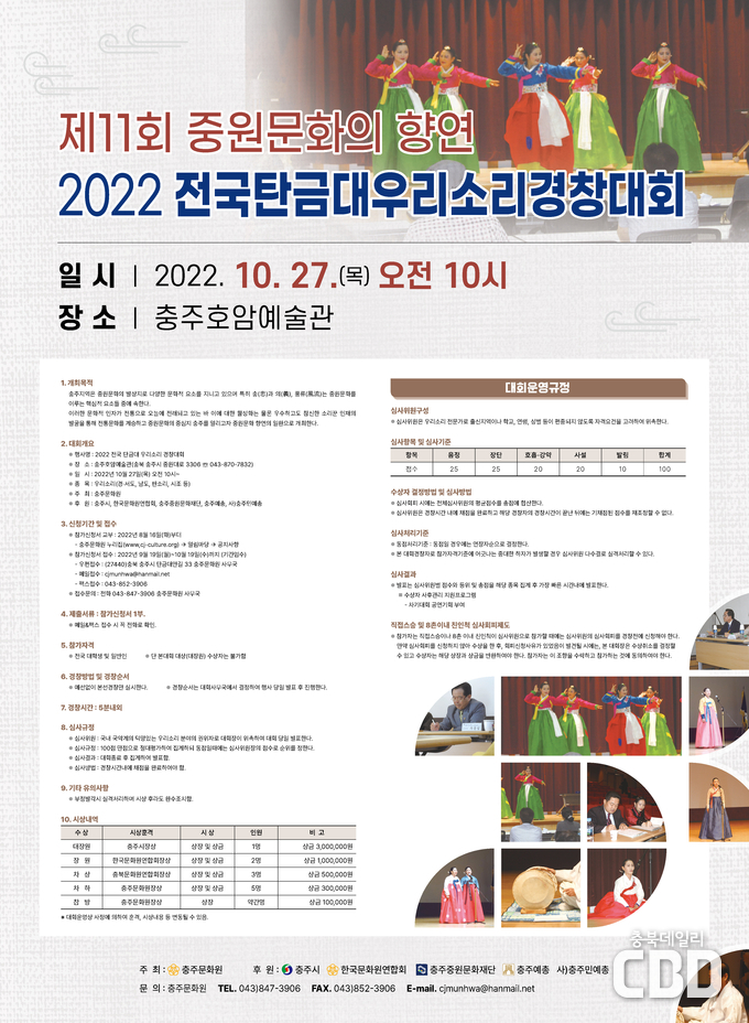 접수는 전국의 대학생 및 일반인 소리꾼들을 대상으로 오는 19일부터 충주문화원 우편접수(충북 충주시 탄금대안길 33 충주문화원 사무국), 메일접수(cjmunhwa@hanmail.net), 팩스접수(☏043-852-3906) 등을 통해 할 수 있다.