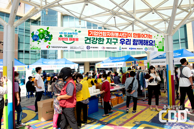 이날 플리마켓은 기업연합자원봉사단의 일원인 △대림비앤코㈜ △㈜동양벤드 △㈜제뉴파마 △영동판지산업㈜ △가축위생방역지원본부 충북도본부 동부사무소 △한국철도공사 대전충청본부 제천역 △한국환경공단 인재개발원의 관계자 및 자원봉사자 등 60여명이 참여했으며,