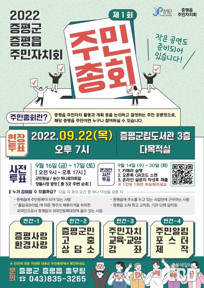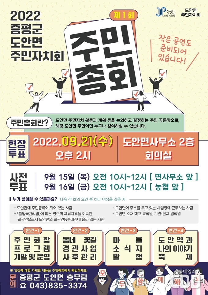 도안면은 21일 오후 2시 도안면사무소 2층에서, 증평읍은 22일 오후 7시 증평군립도서관 다목적실(3층)에서 주민총회가 열린다.