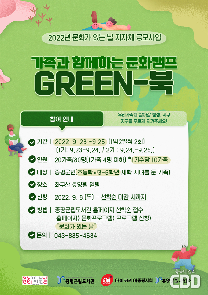 증평군(군수 이재영)과 아이코리아 증평군지회(회장 이수희)는 이달 23일부터 25일까지 좌구산 자연휴양림 일원에서‘가족과 함께하는 문화캠프 그린-북’을 진행한다.