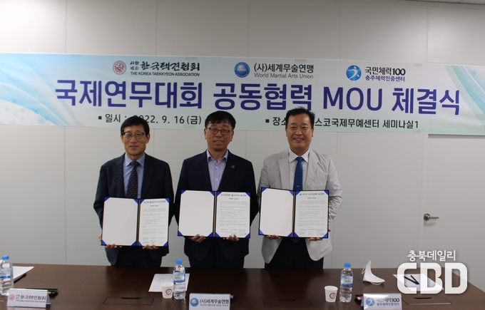 사단법인세계무술연맹(총재:정화태)은 유네스코 국제무예센터의 예산지원으로 충북의 축적된 무예사업 유산을 기반으로 국내 최초로 디지털 플랫폼 정부 개념을 적용한 「2세대 국제연무대회」를 추진 중이며, 이와 관련 9. 16(금) 이 대회의 성공 개최를 위해 (사)한국택견협회, 국민체력100충주체력인증센터와 업무협약(MOU)을 체결하였고 각 기관은 특화된 사업영역에서의 상호 협력과 지원을 통해 대회를 체계적으로 준비·개최하고 지속적으로 발전시켜 나아갈 것을 다짐했다.