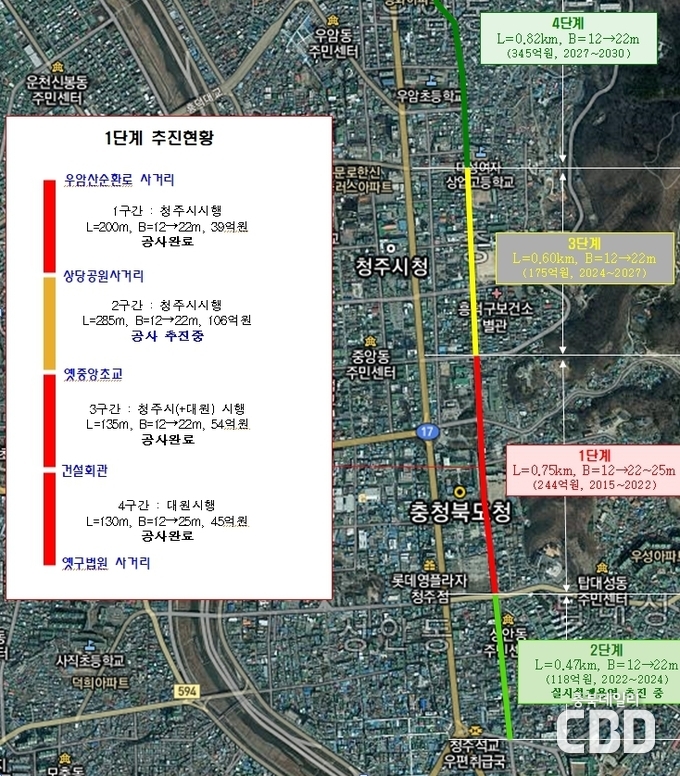 청주시 관계자는 “공사 기간 동안 차로 조정 및 교통 전환으로 통행에 어려움이 있으나 협조해주시는 시민들께 감사드린다”며, “공사가 조속히 추진될 수 있도록 건축물 철거공사와 도로 공사를 계획대로 추진하도록 최선을 다하겠다”며, “1단계가 마무리되는 대로 2단계 공사(구법원사거리~영운로 일원)도 조속히 추진될 수 있도록 설계 및 보상 업무에 만전을 기하겠다”고 말했다.