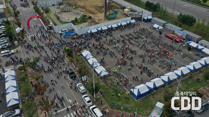 25일 괴산 수산식품거점단지에서 열린 「2022년 자연과 함께하는 청정괴산 그란폰도 자전거대회」(이하 ‘청정괴산 자전거대회’) 개회식에서 참가자 1,900명(선수 1,700명, 운영관계자 및 기타 200명)이 엑스포 성공개최를 다짐하는 퍼포먼스를 함께 했다.