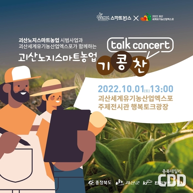 충북 괴산군은 오는 10월 1일 ‘2022괴산세계유기농산업엑스포’ 주제전시관 행복토크 광장에서 노지스마트농업과 유기농의 미래에 대해 이야기하는 ‘기콩찬 노지농업생활’ 토크콘서트를 개최한다고 밝혔다.
