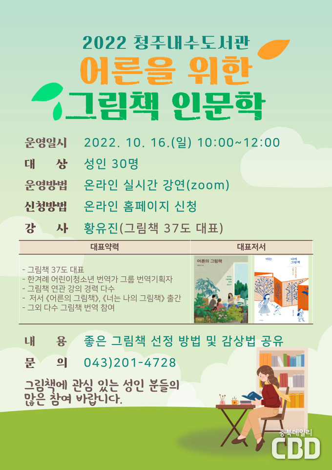 청주내수도서관은 10월 16일 오전 10시부터 ‘어른을 위한 그림책 인문학’ 특강을 비대면 온라인 방식(zoom)으로 운영한다.