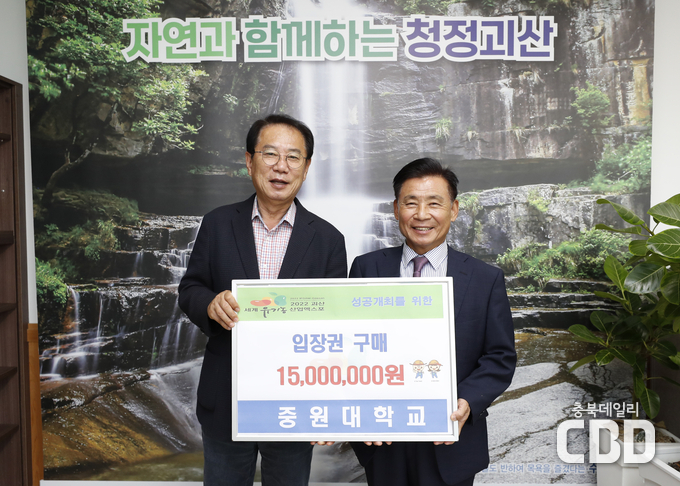 충북 괴산군은 지난 26일 중원대학교(총장 황윤원)가 2022괴산세계유기농산업엑스포의 성공 개최를 응원하며 1,500만원 상당 입장권을 구매했다고 밝혔다.