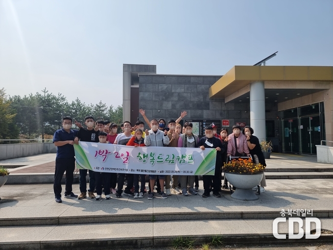 진천군장애인주간보호시설(시설장 김형완)은 지난 29일부터 30일까지 이틀 동안 장애인주간보호 이용자를 대상으로‘1박 2일 행복드림 캠프’를 실시했다고 30일 밝혔다. 캠프은 지역 내 위치한 물안뜰체험휴양마을과 충북진천문학관으로 진행됐으며 독도체험관 견학을 시작으로 공예 체험, 숯부작 만들기 등 체험활동의 시간을 가졌다.